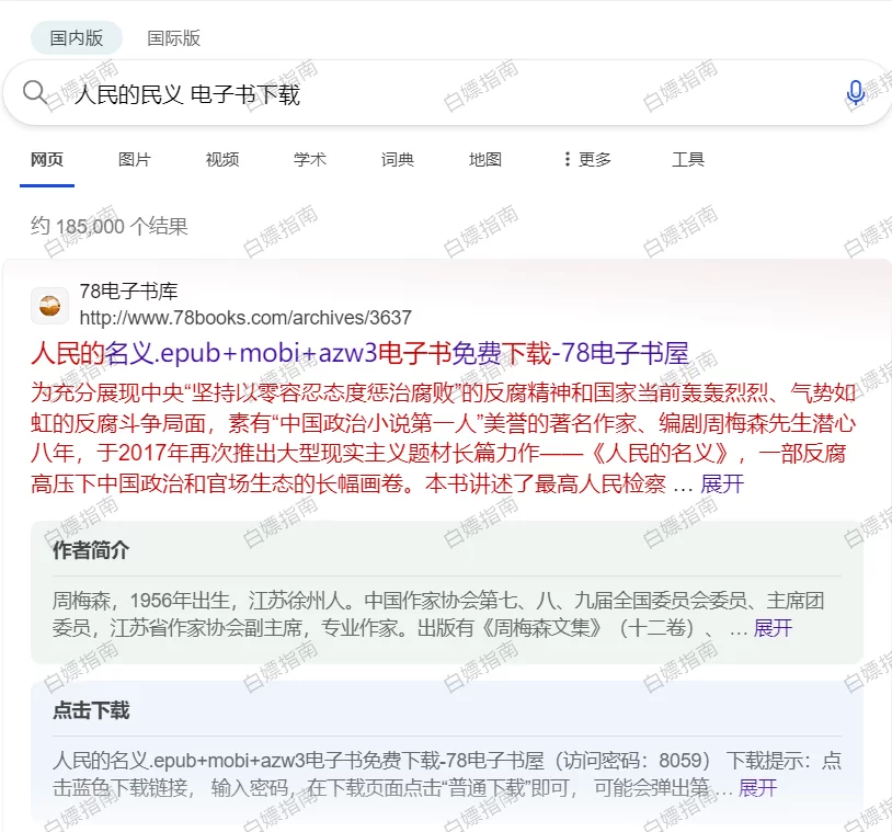 通过搜索引擎去搜索相关电子书资源是最简单基础的方法,以周梅森的人民的民义为例,在必应搜索“书籍名+电子书下载”,即可查到各种下载电子书的网站,点进去就可以下载,建议在必应搜索,国内版必应限制比百度少,搜到的内容质量也更高一点。除了上述搜索内容还可以按下面的关键字来搜索: